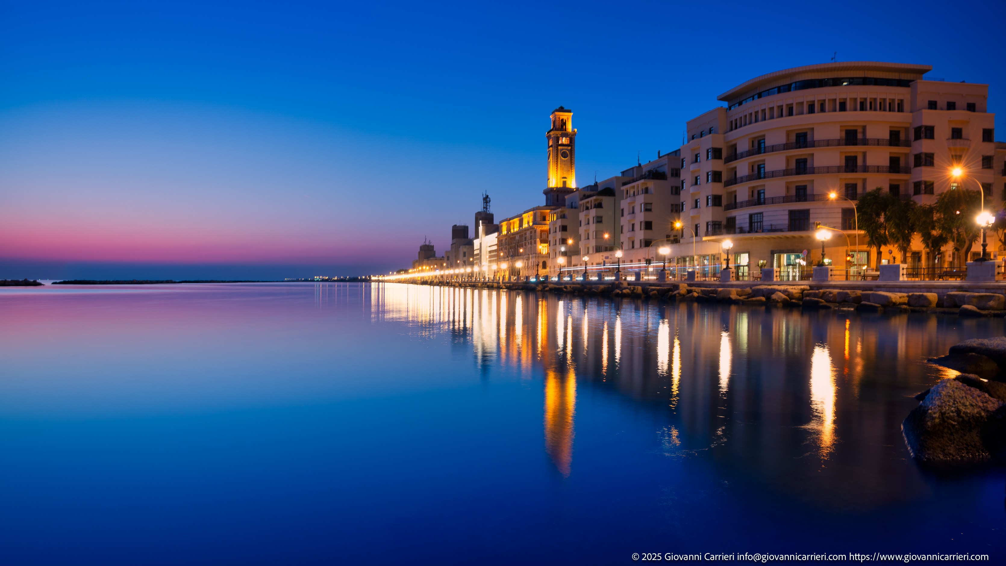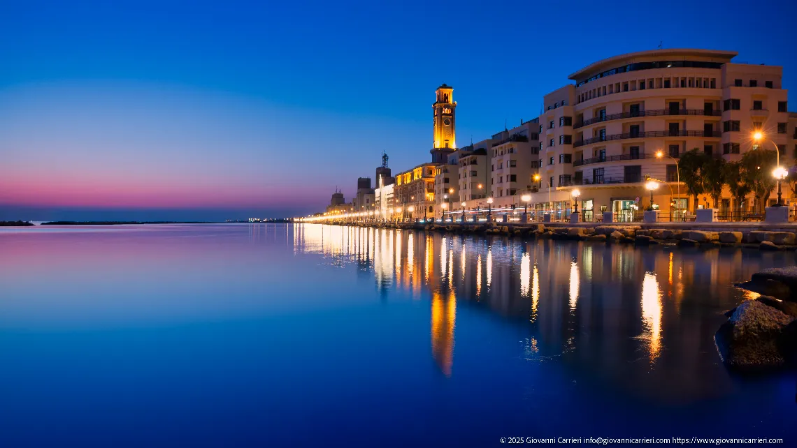 The Nazario Sauro Promenade in Bari extends along the Adriatic coast and constitutes an urban infrastructure that defines the city's waterfront. Its construction is part of the urban development plan initiated during the Fascist era, with the aim of connecting the old town with the port area and giving the city a monumental and modern appearance. The captured section, seen from Largo Giannella, shows the sequence of buildings facing the sea, characterized by Rationalist architecture and uniform height. The distinctive vertical element is the illuminated tower of the Palazzo della Provincia (Provincial Palace), built between 1930 and 1934, which symbolizes institutional authority on the shoreline. The wide expanse of water reflects the artificial lights, creating a reflection effect that highlights the beginning of the day and the relationship between the marine environment and the urban development of the Apulian capital.