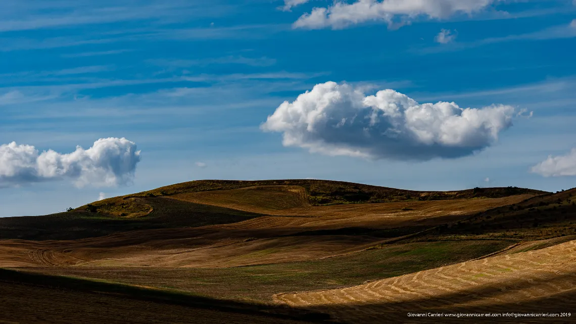 Nei dintorni di Acerenza, la luce dorata del tramonto illumina le colline creando un''atmosfera magica. La collina in primo piano, illuminata dai raggi radenti del sole, risplende di tonalita calde che vanno dal giallo all''arancio intenso. Le ombre lunghe accentuano le ondulazioni del terreno, rivelando le sottili variazioni altimetriche del paesaggio. Acerenza, antica citta vescovile arroccata su un colle, domina questo territorio che segna il passaggio tra l''Altopiano delle Murge e le prime propaggini dell''Appennino lucano. I campi, gia mietuti, mostrano le stoppie che riflettono la luce del crepuscolo.