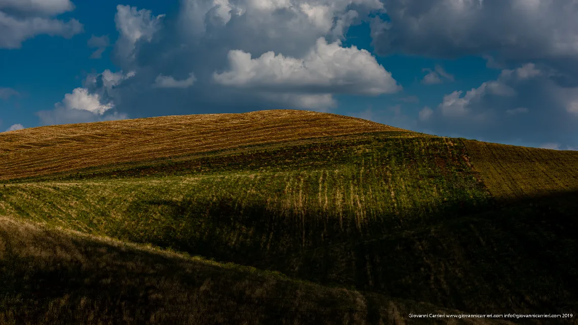 La strada verso Oppido Lucano attraversa un paesaggio dove la luce gioca con le forme delle colline creando effetti drammatici. Le nuvole proiettano ombre scure sul terreno, creando un mosaico di zone illuminate e zone in penombra che cambia continuamente. I campi, con le loro diverse tonalita di verde e marrone, testimoniano le varie fasi della lavorazione agricola. Oppido Lucano, piccolo centro lucano arroccato su un colle, si trova al margine orientale dell''Altopiano delle Murge, in una zona di transizione verso le valli interne della Basilicata. Questo scorcio cattura la natura mutevole del paesaggio murgiano.