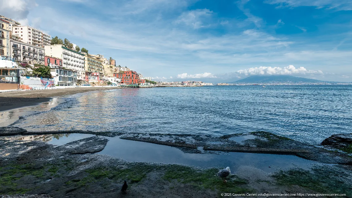 La composizione documenta una vista della spiaggia sulla costa di Posillipo, nel Golfo di Napoli. In primo piano, la linea di costa è definita da affioramenti rocciosi e una porzione di sabbia scura lambita dall'acqua. Sulla sinistra, l'edificazione residenziale della collina di Posillipo scende verso il mare, con strutture colorate che riflettono la luce diurna. La superficie marina occupa la porzione centrale, estendendosi fino all'orizzonte. Sullo sfondo, il profilo conico del Vesuvio si staglia nettamente nel panorama orientale.