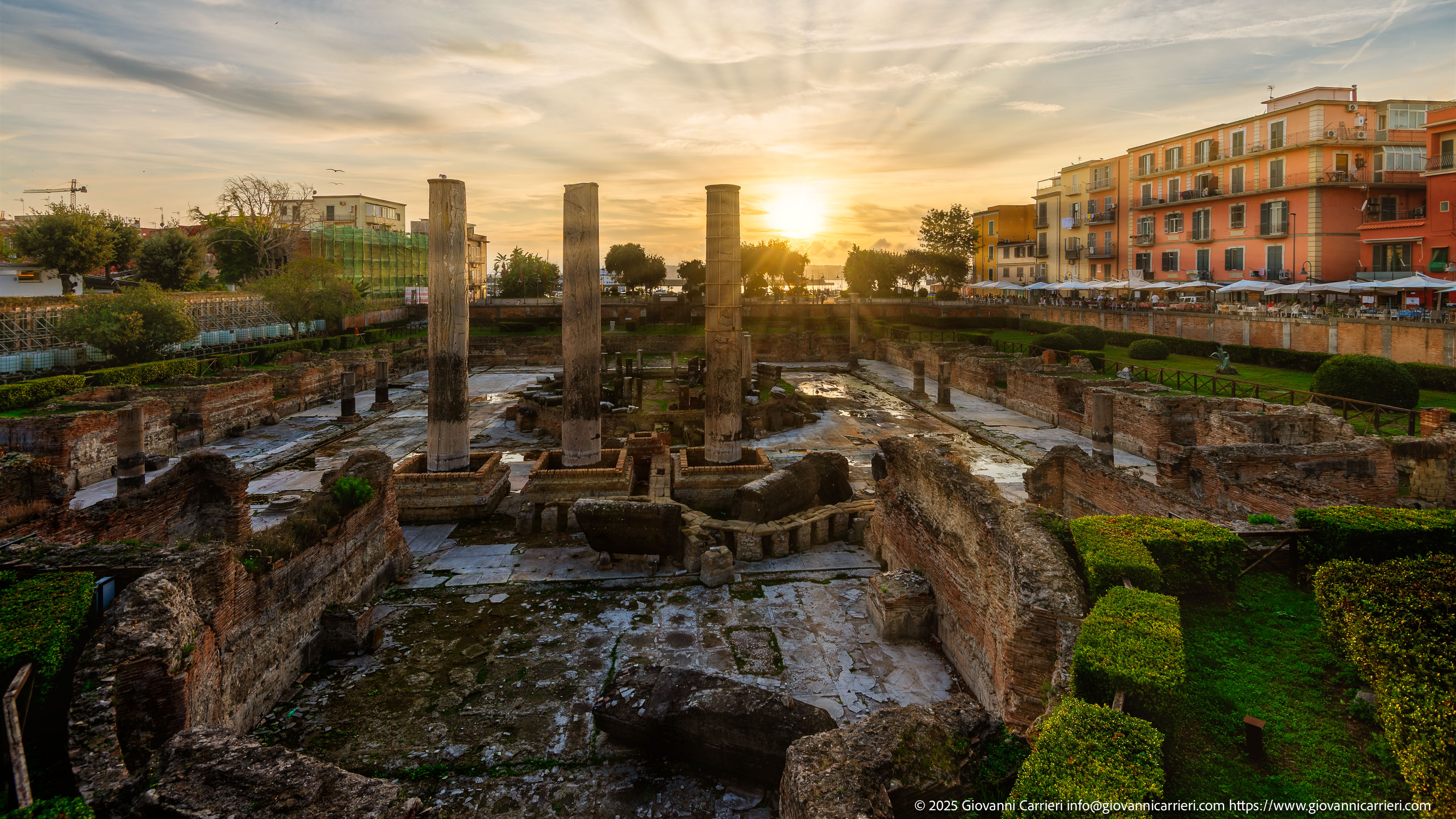 La composizione documenta la vista occidentale dei resti archeologici del Macellum romano di Pozzuoli, erroneamente noto come Tempio di Serapide. L'immagine è stata acquisita al tramonto, con il sole che cala sull'orizzonte e genera raggi luminosi centrali sopra le rovine. Al centro del sito si ergono le tre colonne residue del colonnato, elementi diagnostici del fenomeno del bradisismo.