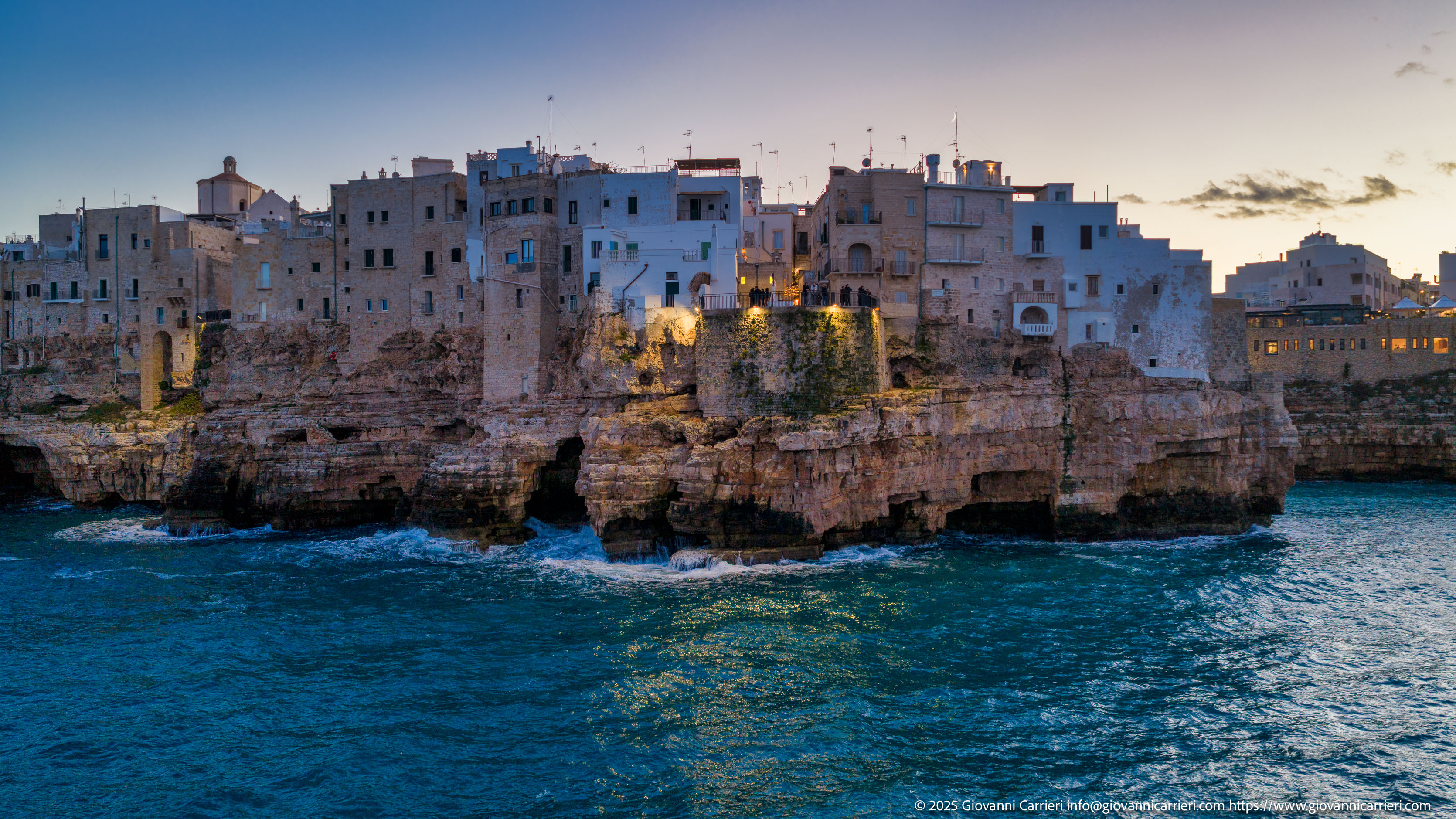 La vista documenta una porzione del centro storico di Polignano a Mare, focalizzandosi sul complesso del Bastione di Santo Stefano. Questo elemento architettonico, insieme alla sua caratteristica terrazza panoramica che sporge sulla falesia, si integra con le abitazioni in calce bianca che sorgono direttamente sul ciglio della scogliera calcarea, a strapiombo sul Mar Adriatico. La configurazione urbana sfrutta la morfologia costiera, tipica di un insediamento che, secondo alcune fonti, fu fondato dal Greco Dionisio II di Siracusa nel IV secolo a.C. Al di sotto delle strutture, sono visibili diverse grotte marine naturali, cavità generate dall'erosione del mare nella roccia. Il momento catturato è il crepuscolo, un'ora in cui le luci artificiali provenienti dal Bastione e dagli altri edifici creano un contrasto caldo con le tonalità fredde del cielo e delle acque marine. La scena illustra l'interazione tra la struttura difensiva storica, l'architettura civile e l'ambiente geologico costiero.