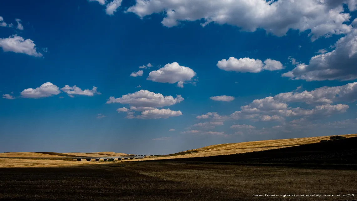 Nei pressi di Spinazzola, l''Altopiano delle Murge si apre in un panorama di straordinaria ampiezza. Le colline ondulate, coperte di campi di grano dorato, si estendono fino a fondersi con l''orizzonte in una visione quasi infinita. Il cielo, che occupa gran parte dell''immagine, e solcato da nuvole che aggiungono drammaticita alla scena. Un viadotto autostradale in lontananza rappresenta l''unico segno evidente della modernita in questo paesaggio altrimenti immutato nei secoli. Spinazzola, situata al confine tra Puglia e Basilicata, e il punto di partenza ideale per esplorare questa porzione dell''Alta Murgia.